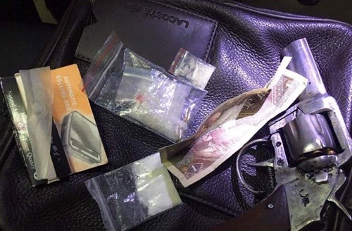 Khẩu súng dạng colt xoay và nhiều túi chứa chất nghi ma túy mà D. mang theo. Ảnh: Quân Nguyễn.